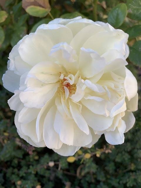 ‘Bolero’ was one of the first roses that I put in the garden. I planted it in a raised bed backed by rosemary, and the combination initially looked great, the rosemary was a dark background to show off the white flowers in front. ‘Bolero’ produced lovely fragrant flowers. But the raised bed with sandy-rocky soil drained too well and water just ran through. I tried adjusting the irrigation emitters, the timing, the frequency, the duration. I tried digging in clay and organic material. The rosemary grew and began to crowd the roses and was a much better water scavenger than the roses. This year, ‘Bolero’ has looked horrible. So either the rosemary or ‘Bolero’ will have to go. Since it has always been ‘Bolero’ that has struggled in this location, it is the one that will go. It is very sad, but part of the evolution of the garden.
